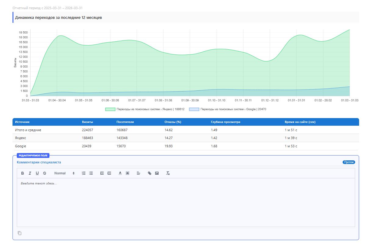 | Индивидуальная кастомизация | Шаблоны под каждый тип клиента (SEO, контекст, комплекс). Каждый отчет можно кастомизировать при необходимости. |