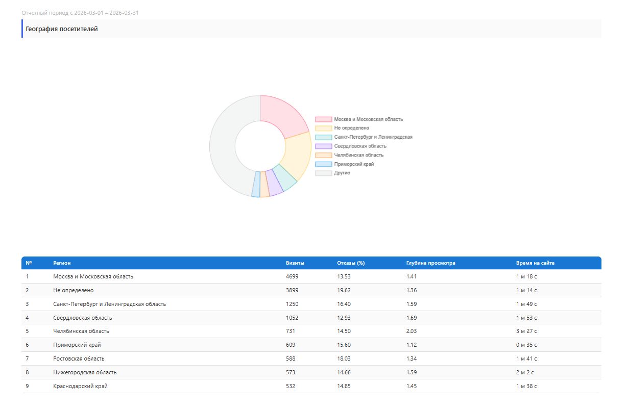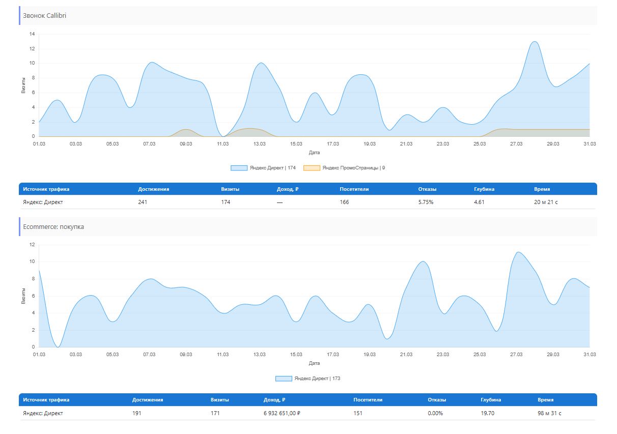 | Яндекс.Метрика | Трафик, поведенческие метрики, конверсии, цели |